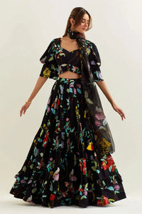 Featuring Canupus High Skirt With Blouse by Label Earthen from Loom Florist Collection. This high-waisted frill skirt with blouse and printed organza skirt is perfect for destination weddings or cocktail events. Its elegant design and intricate details ensure a sophisticated, standout look.