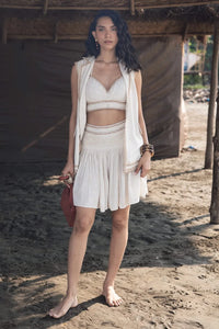 This fashionable set includes a sleeveless blazer and bralette with unique jute lace detailing, paired with a flattering pleated short skirt. A perfect blend of chic sophistication and playful charm.