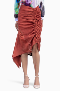 This caramel brown Midi Skirt is made of soft Muslin Silk and features adjustable ruching detail. It is lined and has a concealed zip fastening, providing both comfort and versatility for office, party, or casual wear. Longest 32" and Shortest at 22"