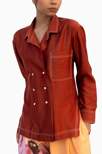 This sophisticated silk shirt boasts a rich caramel color and an overlap front with shell button closures. Designed with side slits and top stitch detailing for enhanced comfort, this classic collared shirt also includes soft elastic at the back for added shaping. Made from muslin silk, it offers the comfort of cotton with the luxurious shine of silk.