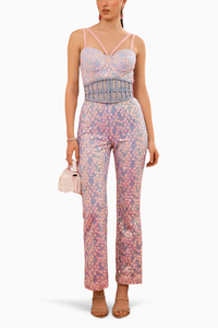 Featuring the Cardi Jumpsuit Set from House of Exotique, featuring a sweetheart neckline jumpsuit adorned with floral sequined lace and embroidered shoulder straps. Paired with a hand-embroidered corset belt, it offers a tailored fit in delightful pink.