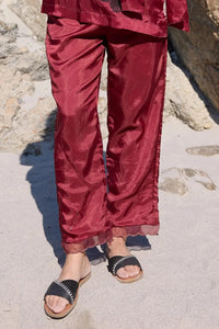 The Carly Maroon Trouser is a stylish pull-on design featuring convenient pockets and a delicate scalloped hem. With its comfortable fit and subtle detailing, these trousers offer a chic and practical addition to any wardrobe.