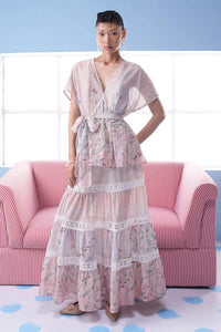 Featuring Carol Pink Lace Meshnet Co-ord Set by Mero's DOT collection. This dreamy ensemble includes a peplum wrap-style top with delicate floral print, short sleeves, and a tie-up waist. It is paired with a tiered meshnet maxi skirt, detailed with lace patchwork and soft botanical prints, perfect for a romantic summer look.