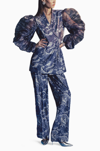 Featuring the Caroline Coord Set, meticulously crafted in printed cherry crepe with intricate organza sleeves. This ensemble seamlessly blends a stylish blazer with coordinating pants, making it a sophisticated and standout choice.