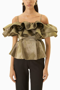 Clare Top is made in silk lama, it's cold shoulder with thin strap hold and has double ruffle detailing on the bust. Peplum in style with center back closure with metal zipper.