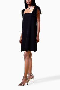 The Casablanca dress is an a-line dress with ostrich fur detailing at the shoulders. It fits slightly fitted at bust and falls loosely over stomach and hips. It's made in crepe and is above knee length.