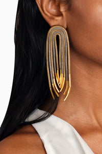 The combination of gold and the dull silver leather creates a beautiful contrast in finishes. The finishing with the gold tips brings the piece together. The cascade earrings are the perfect pieces to light up your look.