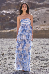 Maxi-length tiered dress in floral printed mesh with softly ruched tiers. Hand-applied pleats on the top. Adjustable, detachable spaghetti straps with adjustable softly criss-crossing loops in the back for improved fitting. Concealed zip at the back waist. Garment is fully lined.