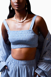 The Casella top features elasticated smocking for a fitted comfortable look. It wears over head and is beautifully paired with the Emilia shirt and Cruise pants. It's made from cotton and comes in a blue and white stripe.