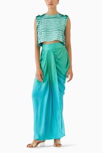 The Caspian Blouse & Draped skirt Co-ord crafted from our stunning Vegan Silk fabrication, trans-seasonal, is a statement piece. The top, made in our hand dyed organza, is part of a 2 piece set. With organza straps, this blouse is hand embroidered with sequin in jewel teal green. Featuring side zippers, this blouse can be styled in different ways. Paired with our Signature Ombrè draped skirt with a side zipper, it looks chic. Wear it with heels for an elegant look.ÂÂÂ