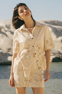 A classic shirt featuring symmetrical cutwork embroidery, elevated with a delicate scalloped hem for a refined and elegant finish.