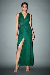 Featuring the Catharine Green Gown by ITRH's Diwali Jaaneman Collection, this bottle green drape gown is beautifully crystal-embellished and designed with a sleek slit, offering a sophisticated and graceful silhouette perfect for a luxurious festive look.