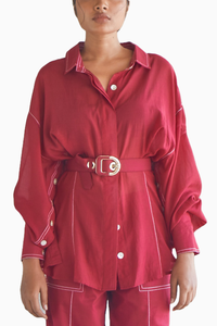 Featuring delicate maroon base with top stitch detail. Simple collar button down and a not so conventional full sleeve button down as well, could be worn with open sleeves as seen on the model or like a classic shirt. Shell button fastening and that belt? Yes, part of your purchase.