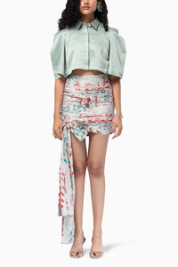 A solid colour cropped shirt with slightly puffed sleeves paired with a gathered skirt with a bow at one side.