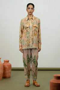 Discover the elegance of the Cedar Sky Co-Ord, featuring a cargo-style mul shirt with appliqué lace embroidery, paired with easy-fit cotton silk trousers. This relaxed yet stylish set offers effortless sophistication for any occasion.