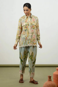 Discover the elegance of our round neck, high-low kurta paired with slim gathered salwar, both rendered in a signature sage print on luxurious chanderi fabric. The kurta as distinctive high-low hemline adds a modern twist, while the slim gathered salwar provides a sleek, graceful silhouette. Enhanced with intricate gota-kinari hand embroidery and detailing. Complementing the ensemble is a dupatta with contrast edging and handmade tassels, adding a touch of artisanal charm and completing the look with sophisticated finesse.