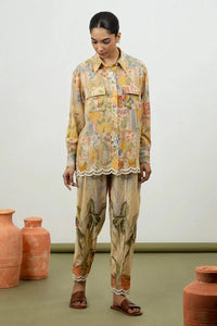 Discover the elegance of the Cedar Yellow Co-Ord, featuring a cargo-style mul shirt with appliqué lace embroidery, paired with easy-fit cotton silk trousers. This relaxed yet stylish set offers effortless sophistication for any occasion.