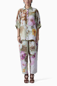 Step into style with this snuff floral printed, handwoven linen kimono shirt, effortlessly paired with matching pants. This ensemble exudes a sense of sophistication and comfort, perfect for any occasion.