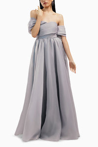 Featuring Celeste Off-Shoulder Pleated Dress by Brinda Sneha by their Love Locked Collection. It's a full-length gown that features a draped bodice with an elegant off-shoulder neckline to create a sophisticated and flattering silhouette, while a gathered skirt gives it a seamless voluminous fit. Perfect for engagements or evening parties, this dress combines timeless style with modern elegance.