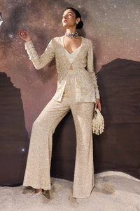 Featuring a delicately embroidered jacket with shimmering beadwork, paired with flared trousers that radiate sophistication. Intricate detailing on the sheer overlay adds depth, while the soft ivory hue enhances its timeless charm. Perfect for elegant evening soirees.