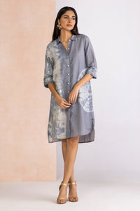 Celestides Shirt Dress is crafted in a breathable linen blend, designed in a button-down silhouette with a collared neckline, signature tie-dye, and gold foiling. Balancing structure with fluid ease, it offers a comfort fit and refined elegance for daytime, festive lunches, and evening occasions.