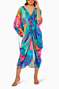 Featuring Celosia Kaftan from Sttavoss's Everbloom Collection. Embrace vivid colors and bold prints with the easy-going nature of this luxury satin kaftan. Perfect for summertime, its free size fit ensures comfort and style.
