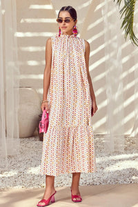 Add a touch of summertime chic to your wardrobe with our vibrant sleeveless dress. Against a crisp white base, the bold print pops with playfulness. Crafted from soft and breathable Rayon Slub fabric, this dress is perfect for warm weather and effortless style. The sleeveless design keeps you cool and carefree, while the relaxed fit ensures comfort all day long.