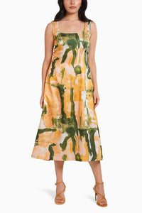 This midi dress is cut in breathable cotton satin and features a structured square neckline with wide straps. Fitted at the bodice and softly flared through the hem, it offers shape without restriction — a silhouette that moves with ease and elegance.