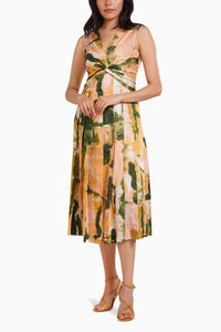 Crafted in cotton satin, this sleeveless midi dress features a flattering twisted knot detail at the waist, a deep V-neckline, and softly structured pleats that fall into a flared silhouette. Designed to accentuate the form while offering ease and movement, it’s your go-to for polished summer dressing.