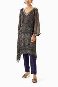 Earthy colours and artistic details lend a signature touch to Kartikeya's pattern tunic. The easeful tunic silhouette is stamped with a vibrant pattern and embellished V neckline  enhances the alluring appeal. Style it with straight pants and slip-on mules for a contemporary and easy look.