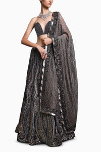 Featuring the CF Black Applique Lehenga with Dupatta by Siddartha Tytler from the CALIGULA Collection. This black velvet lehenga is adorned with gunmetal and gold applique, zircons, crystals, and crystal rope embroidery. Paired with a crystal rope bustier and an embroidered tissue dupatta for a regal finish.