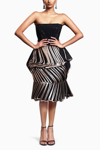 Featuring the CF Black Cascade Dress by Siddartha Tytler from the CALIGULA Collection. This black and gold cascade dress is paired with a crystal-encrusted corset, offering a dramatic blend of opulence and intricate design for a show-stopping look.