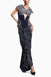 Featuring the CF Black Slub Leggings Drape Skirt by Siddartha Tytler from the CALIGULA Collection. This black slub knit draped skirt is paired with metallic churidaars, combining effortless drape with contemporary metallic accents for a chic, modern look.