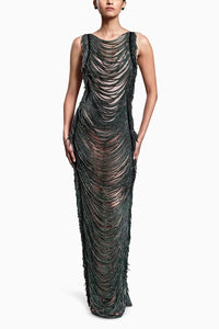 Featuring the CF Emerald Crystal Rope Gown by Siddartha Tytler from the CALIGULA Collection. This emerald and gunmetal crystal rope backless cascade gown offers a striking blend of opulent detailing and dramatic elegance, creating a bold and luxurious silhouette.