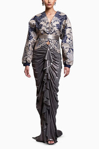 Featuring the CF Grey Cascade Skirt by Siddartha Tytler from the CALIGULA Collection. This grey shimmer spandex skirt features a cascading draped design, combining sleek sophistication with luxurious movement for a striking and elegant look.