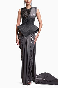 Featuring the CF Gunmetal Corseted Saree by Siddartha Tytler from the CALIGULA Collection. This gunmetal draped spandex saree is paired with a crystal rope embroidered corseted kamarbandh and a sheer velvet strip-work blouse, blending modern glamour with traditional allure.
