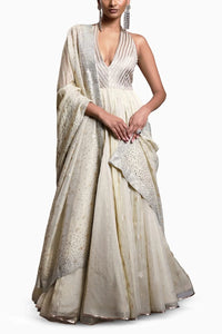 Featuring the CF Ivory Gradient Anarkali by Siddartha Tytler from the CALIGULA Collection. This ivory chanderi paneled anarkali is paired with a strip work halter and a crystal gradient chanderi dupatta, offering a sophisticated blend of traditional craftsmanship and modern elegance.
