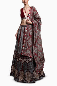 Featuring the CF Maroon Applique Lehenga Set by Siddartha Tytler from the CALIGULA Collection. This maroon velvet lehenga is adorned with gold-gunmetal applique, zircons, crystals, and crystal rope embroidery, paired with a velvet backless blouse and a tissue, applique, and crystal dupatta for a regal, luxurious ensemble.