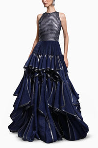 Featuring the CF Navy Cascade Gown by Siddartha Tytler from the CALIGULA Collection. This navy organza tiered cascade gown is enhanced with gunmetal highlights and a strip-work halter bust, offering a blend of dramatic elegance and modern sophistication.