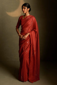 This mul chanderi saree brings old-world charm to life, dreamy as the night sky. Spaced across the drape are large crescent motifs, each filled with delicate star embroidery and smaller crescent moons crafted in shiny glass. Paired with a sleeved blouse featuring subtle handwork of tiny glass-beaded crescents, it’s a celestial ensemble that feels timeless, graceful, and truly enchanting.