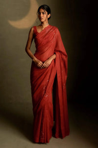 This mul chanderi saree brings old-world charm to life, dreamy as the night sky. Spaced across the drape are large crescent motifs, each filled with delicate star embroidery and smaller crescent moons crafted in shiny glass. Paired with a plain mul chanderi sleeveless blouse, it’s a celestial ensemble that feels timeless, graceful, and truly enchanting.
