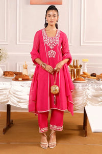 Featuring lightweight, breathable Cotton Chanderi, this ensemble is elevated with delicate thread embroidery that adds refined charm. The elegant square neckline offers a flattering finish, complemented by 3/4th sleeves for effortless grace. Beautiful embroidery along the pant edges creates a cohesive, polished appearance, while the coordinated dupatta completes the look with timeless sophistication.