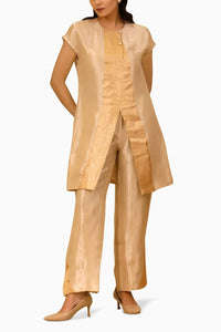 The ensemble features a straight, short silk tissue kurta with stylish drop shoulders and a sleek crew neck. Highlighting the kurta is a golden patch on the front placket, adding a touch of glamour. The sleeveless design enhances its contemporary appeal. The outfit is completed with straight-cut pants crafted from fine tissue fabric. These pants are adorned with unique patchwork at the bottom, further elevating the set's chic and polished look.