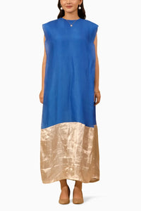 A chic dress featuring shoulder pleats and a rich brocade tissue patch. This ankle-length, sleeveless silk tissue dress embodies elegance and sophistication.