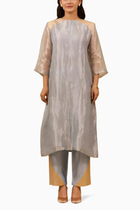 The ensemble is highlighted by a straight, long silk tissue kurta with a simple crew neck and elbow-length sleeves, offering a sleek and refined silhouette. Complementing the kurta, the straight-cut pants are made from luxurious Chiniya silk. They feature distinctive patches at the bottom, adding an artistic touch to the overall design. This pairing embodies a blend of classic style and modern sophistication.