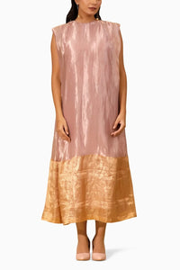 A chic dress featuring shoulder pleats and a rich brocade tissue patch. This ankle-length, sleeveless silk tissue dress embodies elegance and sophistication. The dress is available in two stunning variations: a vibrant blue organza dress with a silver patch, and a lilac silk tissue dress enhanced with a golden patch.