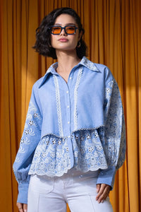 Broderie Anglais Blouse – Beautifully crafted button-down blouse featuring delicate broderie on soft chambray fabric for a timeless appeal.