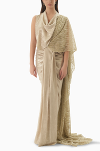 Featuring the Champagne Drift Saree Set by Renasci from the Untamed Collection. Luxurious Sandwash Satin paired with Shimmer Fabric shapes a fitted ensemble with a top and skirt, radiating elegance in timeless champagne hues.
