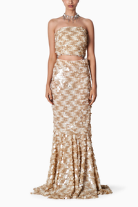 The sequin tube‚ is an amalgamation of‚ sequins and ombre . It has a tube top Silhouette‚ with‚ a curved shaped hemline. This statement tube‚ can be worn with pants or a sari. Paired with the Marina Skirt is cut in a mermaid skirt fit which is fitted till knee and have godet below that which gives a good flare to the skirt‚ and is enhanced with hand embroidered sequins to resemble a zig zag pattern. It closes on the side with a concealed zip.