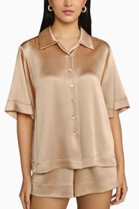 Featuring the Champagne Silk Bowling Shirt by Refined Revolution. Luxuriously crafted from 100% silk charmeuse satin, adorned with shell effect buttons. Its A-line fit with back yoke gathers ensures a relaxed yet stylish look, true to size.